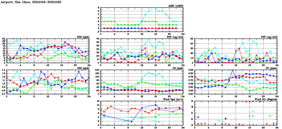 | Air Quality Data Time Series in Airport, Sha Chau (2021/10/22) | ( Line colors: Day -3 Day -2 Day -1 Current day ) | 2D Map Current AQHI |
