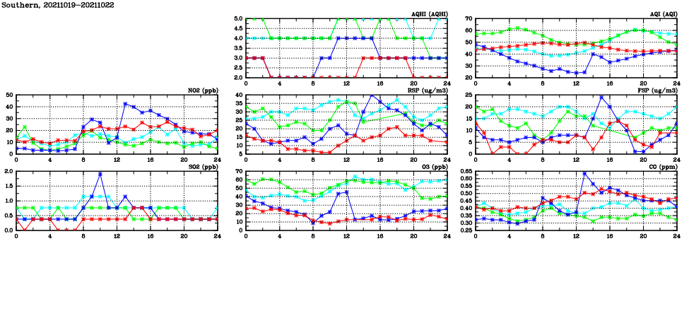 | Air Quality Data Time Series in Southern (2021/10/22) | ( Line colors: Day -3 Day -2 Day -1 Current day ) | 2D Map Current AQHI |