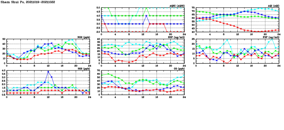 | Air Quality Data Time Series in Sham Shui Po (2021/10/22) | ( Line colors: Day -3 Day -2 Day -1 Current day ) | 2D Map Current AQHI |