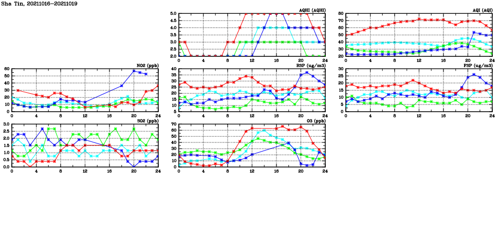 | Air Quality Data Time Series in Sha Tin (2021/10/19) | ( Line colors: Day -3 Day -2 Day -1 Current day ) | 2D Map Current AQHI |