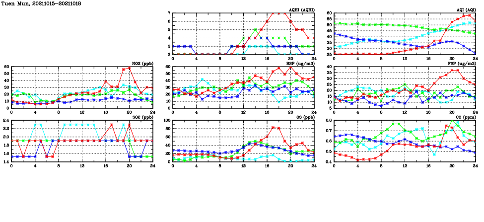 | Air Quality Data Time Series in Tuen Mun (2021/10/18) | ( Line colors: Day -3 Day -2 Day -1 Current day ) | 2D Map Current AQHI |