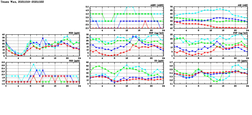 | Air Quality Data Time Series in Tsuen Wan (2021/10/22) | ( Line colors: Day -3 Day -2 Day -1 Current day ) | 2D Map Current AQHI |