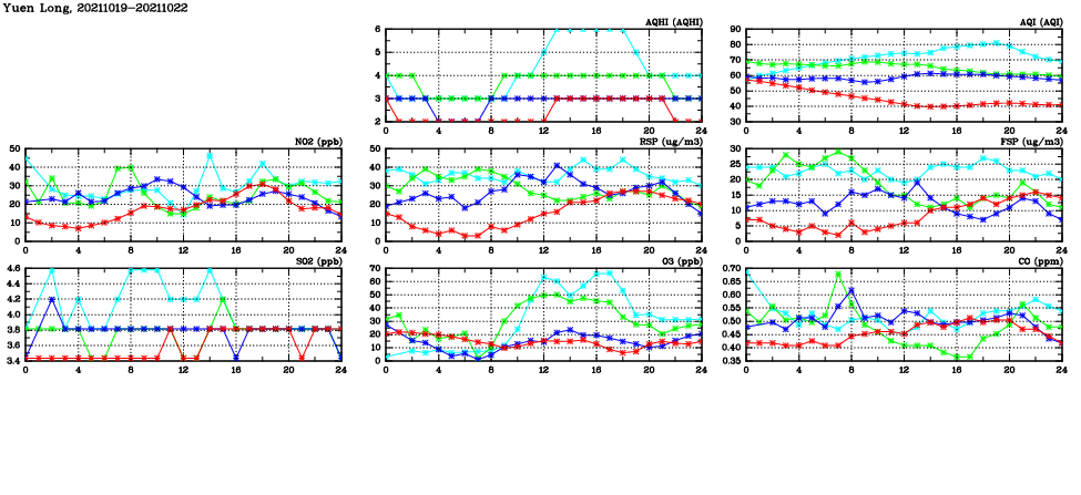 | Air Quality Data Time Series in Yuen Long (2021/10/22) | ( Line colors: Day -3 Day -2 Day -1 Current day ) | 2D Map Current AQHI |