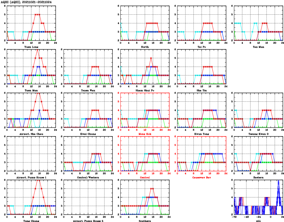 | Air Quality Data Time Series for AQHI (2021/10/24) | ( Line colors: Day -3 Day -2 Day -1 Current day ) | 2D Map Current AQHI |