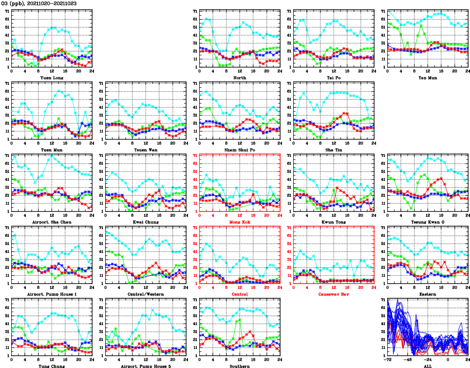 | Air Quality Data Time Series for O3 (2021/10/23) | ( Line colors: Day -3 Day -2 Day -1 Current day ) | 2D Map Current AQHI |