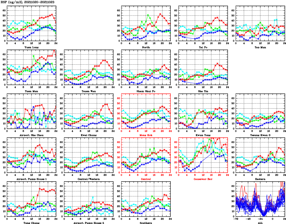 | Air Quality Data Time Series for RSP (2021/10/23) | ( Line colors: Day -3 Day -2 Day -1 Current day ) | 2D Map Current AQHI |