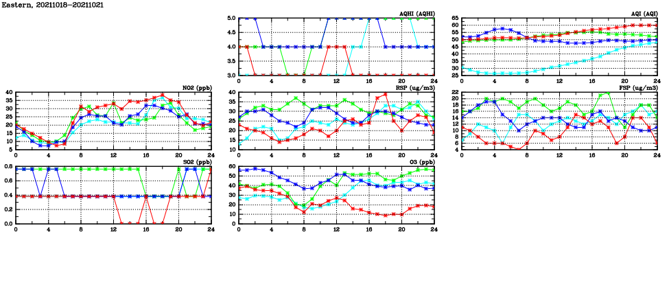 | Air Quality Data Time Series in Eastern (2021/10/21) | ( Line colors: Day -3 Day -2 Day -1 Current day ) | 2D Map Current AQHI |