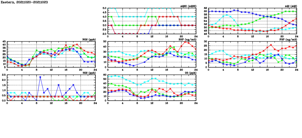 | Air Quality Data Time Series in Eastern (2021/10/23) | ( Line colors: Day -3 Day -2 Day -1 Current day ) | 2D Map Current AQHI |