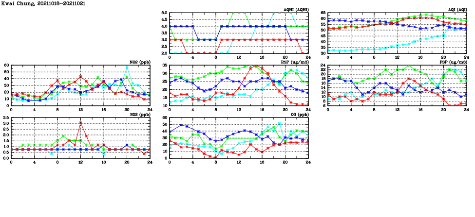 | Air Quality Data Time Series in Kwai Chung (2021/10/21) | ( Line colors: Day -3 Day -2 Day -1 Current day ) | 2D Map Current AQHI |
