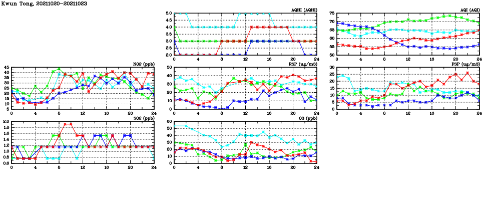 | Air Quality Data Time Series in Kwun Tong (2021/10/23) | ( Line colors: Day -3 Day -2 Day -1 Current day ) | 2D Map Current AQHI |