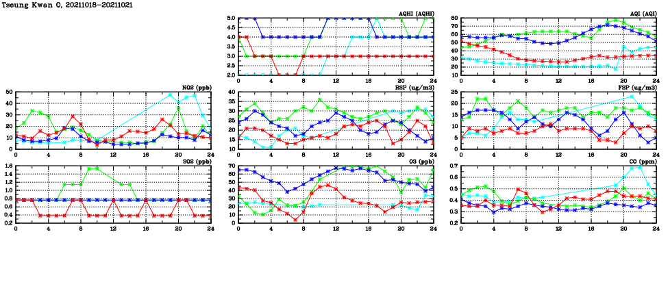 | Air Quality Data Time Series in Tseung Kwan O (2021/10/21) | ( Line colors: Day -3 Day -2 Day -1 Current day ) | 2D Map Current AQHI |