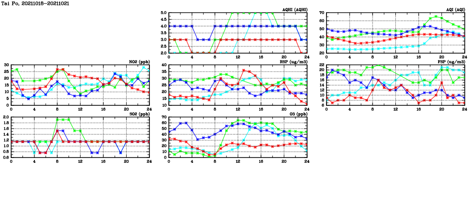 | Air Quality Data Time Series in Tai Po (2021/10/21) | ( Line colors: Day -3 Day -2 Day -1 Current day ) | 2D Map Current AQHI |