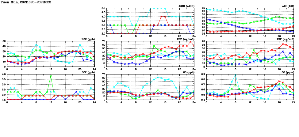 | Air Quality Data Time Series in Tuen Mun (2021/10/23) | ( Line colors: Day -3 Day -2 Day -1 Current day ) | 2D Map Current AQHI |