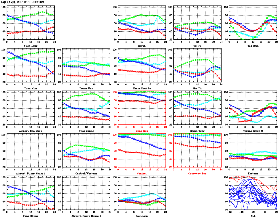 | Air Quality Data Time Series for AQI (2021/11/21) | ( Line colors: Day -3 Day -2 Day -1 Current day ) | 2D Map Current AQHI |