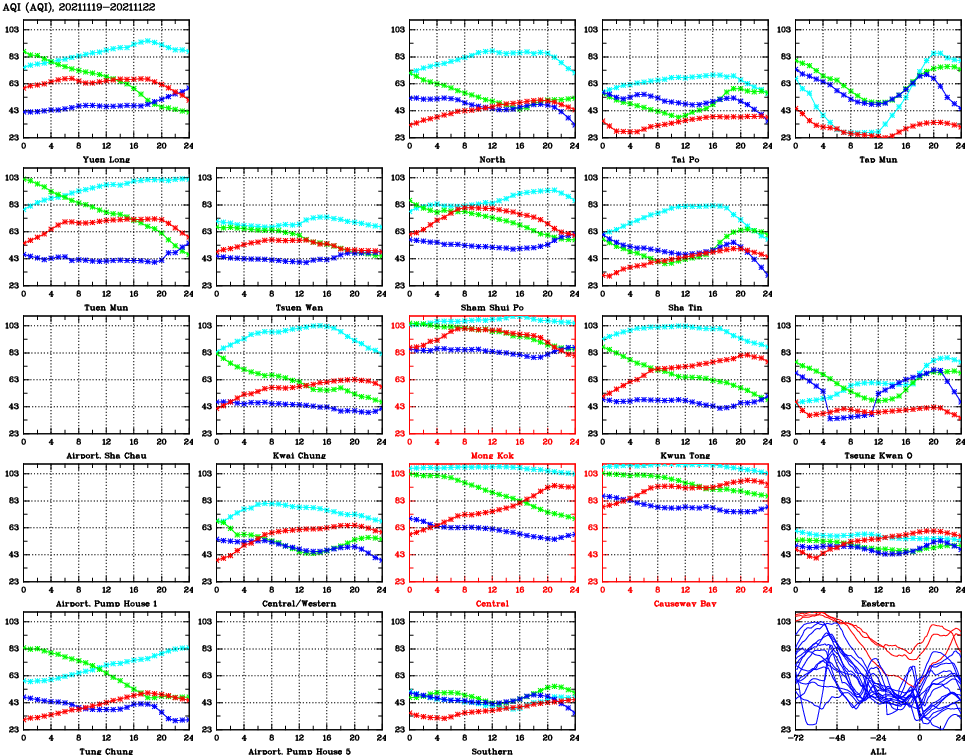 | Air Quality Data Time Series for AQI (2021/11/22) | ( Line colors: Day -3 Day -2 Day -1 Current day ) | 2D Map Current AQHI |
