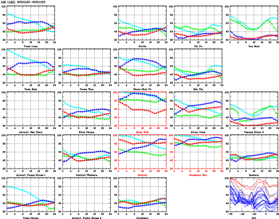 | Air Quality Data Time Series for AQI (2021/11/23) | ( Line colors: Day -3 Day -2 Day -1 Current day ) | 2D Map Current AQHI |