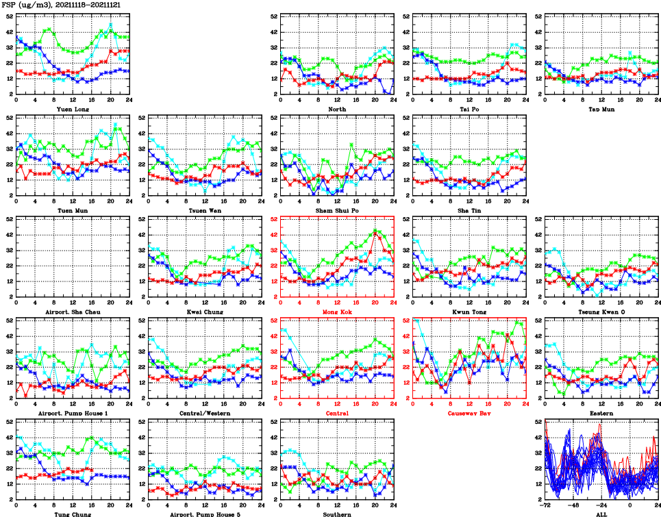 | Air Quality Data Time Series for FSP (2021/11/21) | ( Line colors: Day -3 Day -2 Day -1 Current day ) | 2D Map Current AQHI |