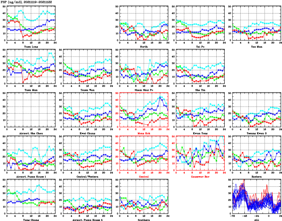 | Air Quality Data Time Series for FSP (2021/11/22) | ( Line colors: Day -3 Day -2 Day -1 Current day ) | 2D Map Current AQHI |