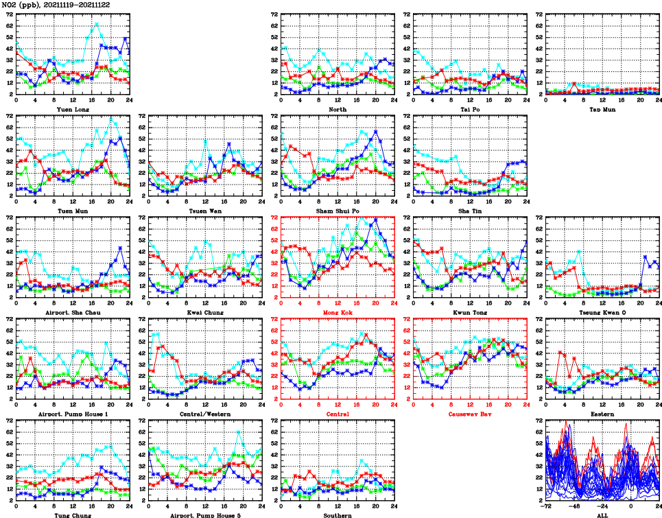 | Air Quality Data Time Series for NO2 (2021/11/22) | ( Line colors: Day -3 Day -2 Day -1 Current day ) | 2D Map Current AQHI |