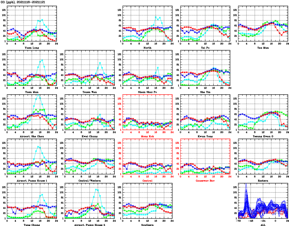 | Air Quality Data Time Series for O3 (2021/11/21) | ( Line colors: Day -3 Day -2 Day -1 Current day ) | 2D Map Current AQHI |