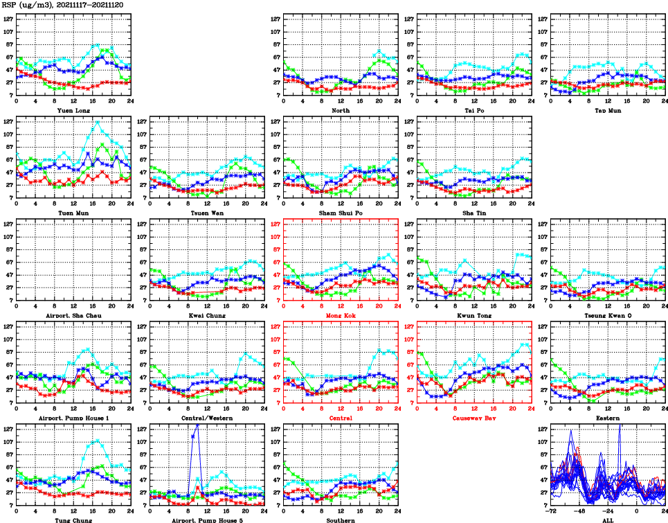 | Air Quality Data Time Series for RSP (2021/11/20) | ( Line colors: Day -3 Day -2 Day -1 Current day ) | 2D Map Current AQHI |