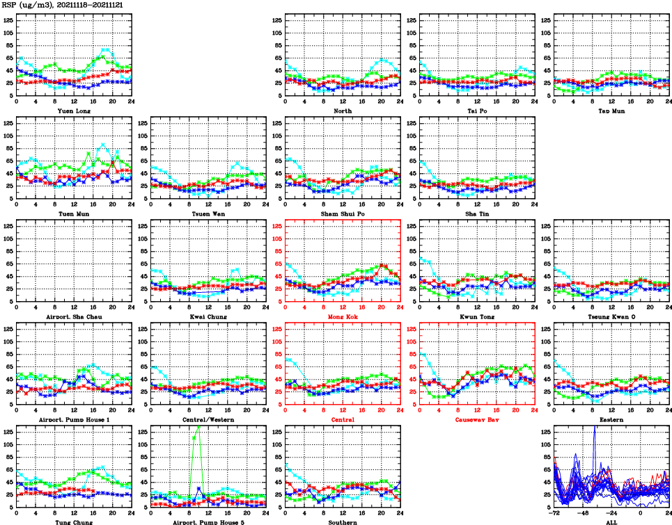 | Air Quality Data Time Series for RSP (2021/11/21) | ( Line colors: Day -3 Day -2 Day -1 Current day ) | 2D Map Current AQHI |