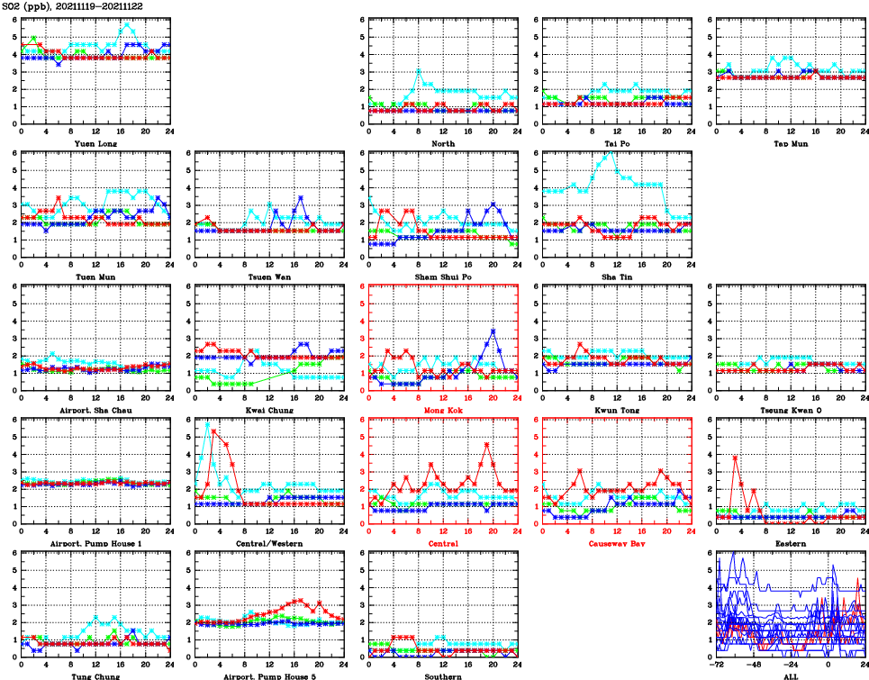 | Air Quality Data Time Series for SO2 (2021/11/22) | ( Line colors: Day -3 Day -2 Day -1 Current day ) | 2D Map Current AQHI |