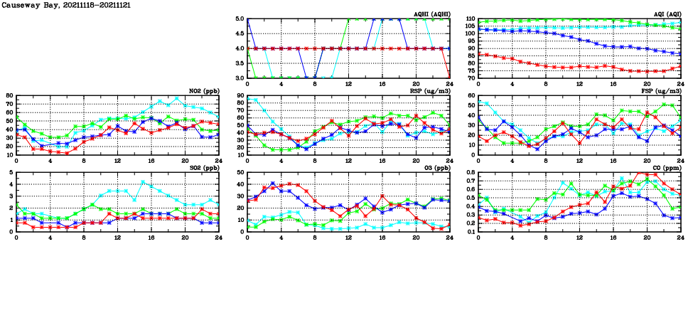 | Air Quality Data Time Series in Causeway Bay (2021/11/21) | ( Line colors: Day -3 Day -2 Day -1 Current day ) | 2D Map Current AQHI |
