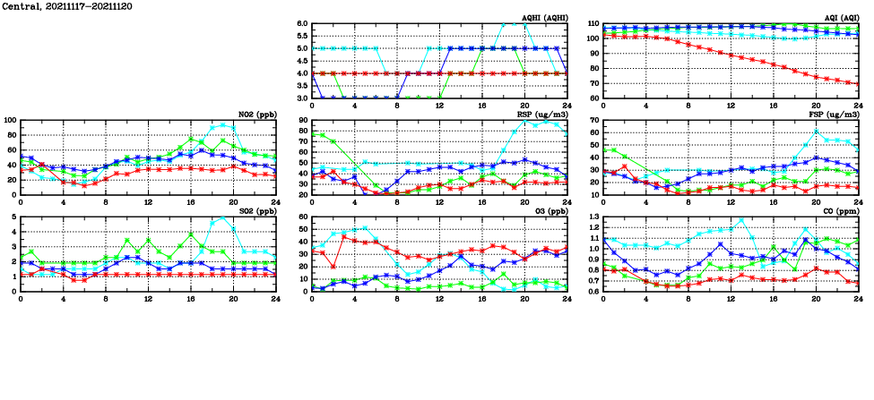 | Air Quality Data Time Series in Central (2021/11/20) | ( Line colors: Day -3 Day -2 Day -1 Current day ) | 2D Map Current AQHI |