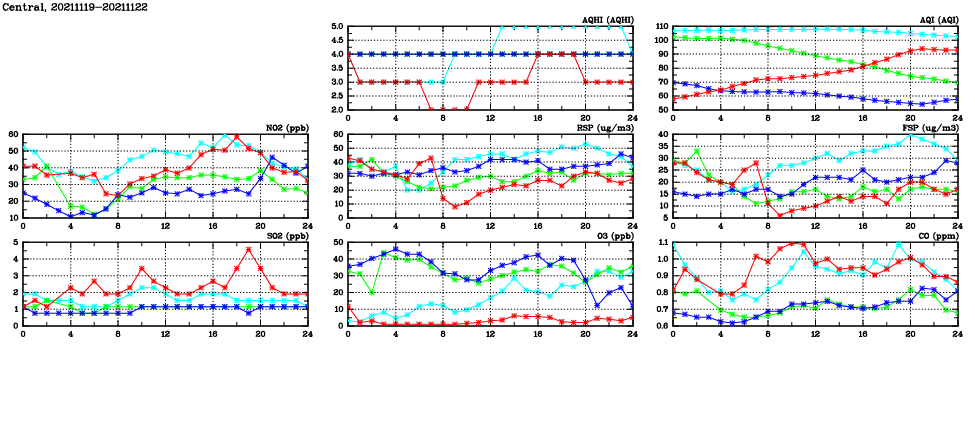 | Air Quality Data Time Series in Central (2021/11/22) | ( Line colors: Day -3 Day -2 Day -1 Current day ) | 2D Map Current AQHI |