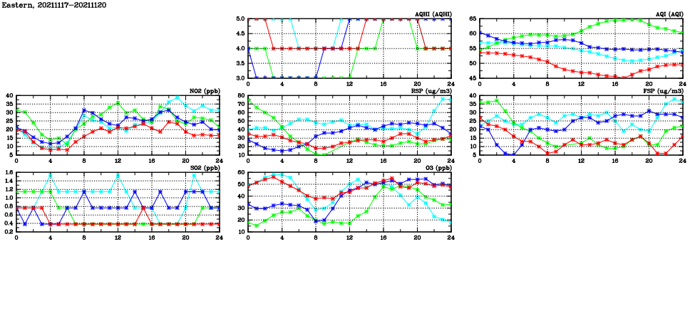 | Air Quality Data Time Series in Eastern (2021/11/20) | ( Line colors: Day -3 Day -2 Day -1 Current day ) | 2D Map Current AQHI |