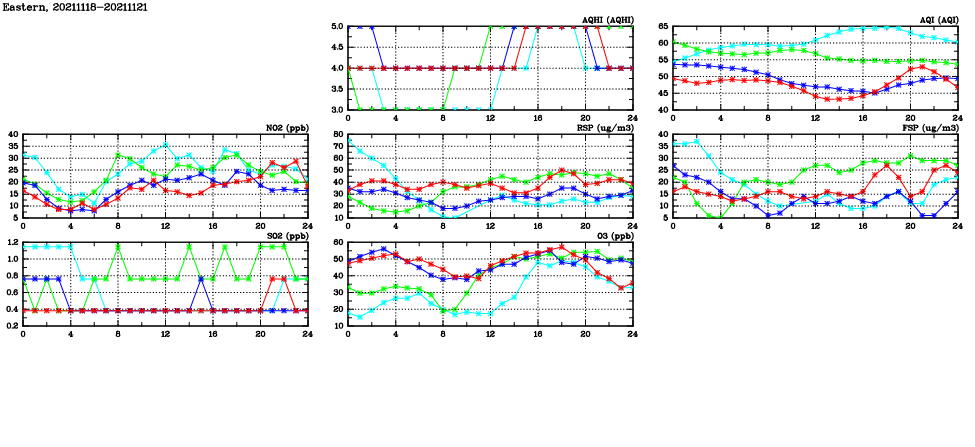 | Air Quality Data Time Series in Eastern (2021/11/21) | ( Line colors: Day -3 Day -2 Day -1 Current day ) | 2D Map Current AQHI |