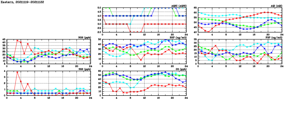 | Air Quality Data Time Series in Eastern (2021/11/22) | ( Line colors: Day -3 Day -2 Day -1 Current day ) | 2D Map Current AQHI |