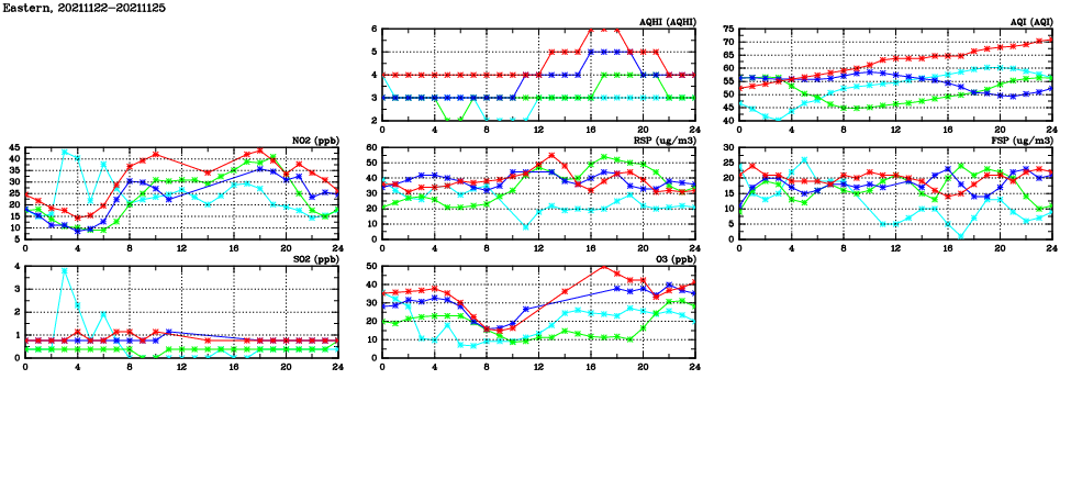 | Air Quality Data Time Series in Eastern (2021/11/25) | ( Line colors: Day -3 Day -2 Day -1 Current day ) | 2D Map Current AQHI |