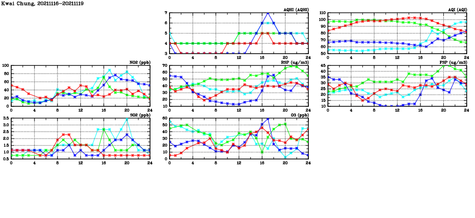| Air Quality Data Time Series in Kwai Chung (2021/11/19) | ( Line colors: Day -3 Day -2 Day -1 Current day ) | 2D Map Current AQHI |