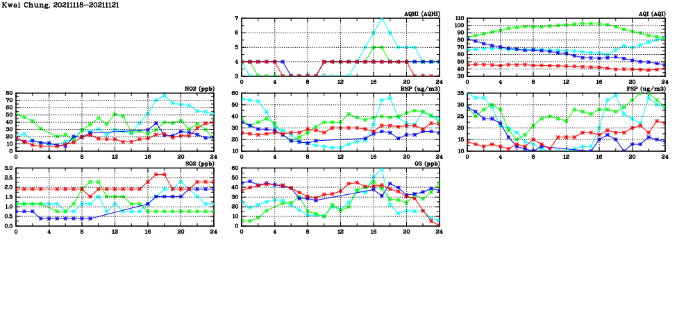 | Air Quality Data Time Series in Kwai Chung (2021/11/21) | ( Line colors: Day -3 Day -2 Day -1 Current day ) | 2D Map Current AQHI |