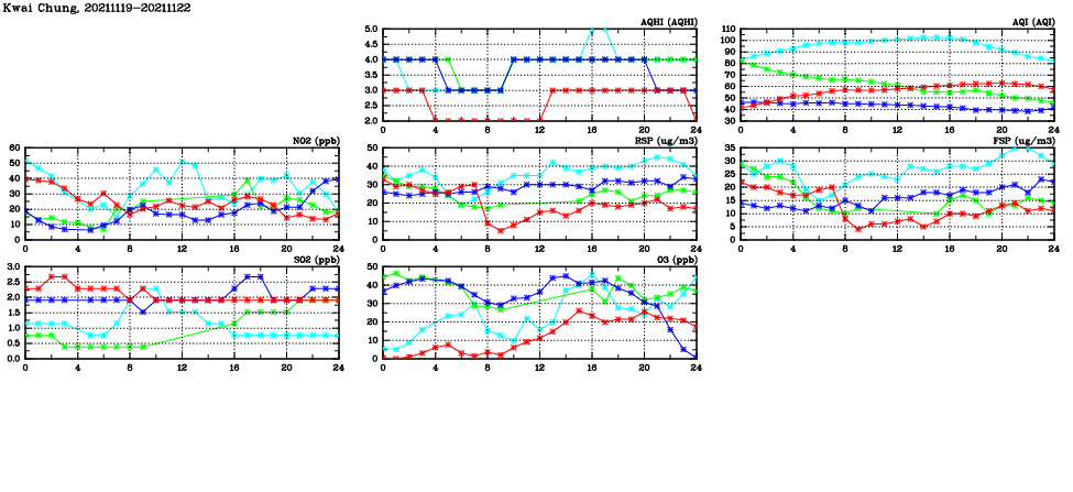 | Air Quality Data Time Series in Kwai Chung (2021/11/22) | ( Line colors: Day -3 Day -2 Day -1 Current day ) | 2D Map Current AQHI |