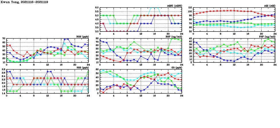 | Air Quality Data Time Series in Kwun Tong (2021/11/19) | ( Line colors: Day -3 Day -2 Day -1 Current day ) | 2D Map Current AQHI |