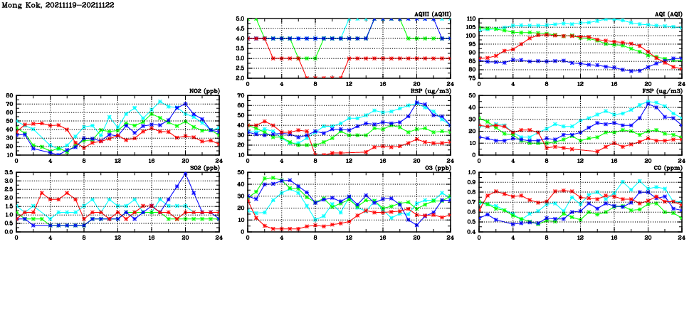 Air Quality Data Time Series in Mong Kok (2021/11/22) | ( Line colors: Day -3 Day -2 Day -1 Current day ) | 2D Map Current AQHI |