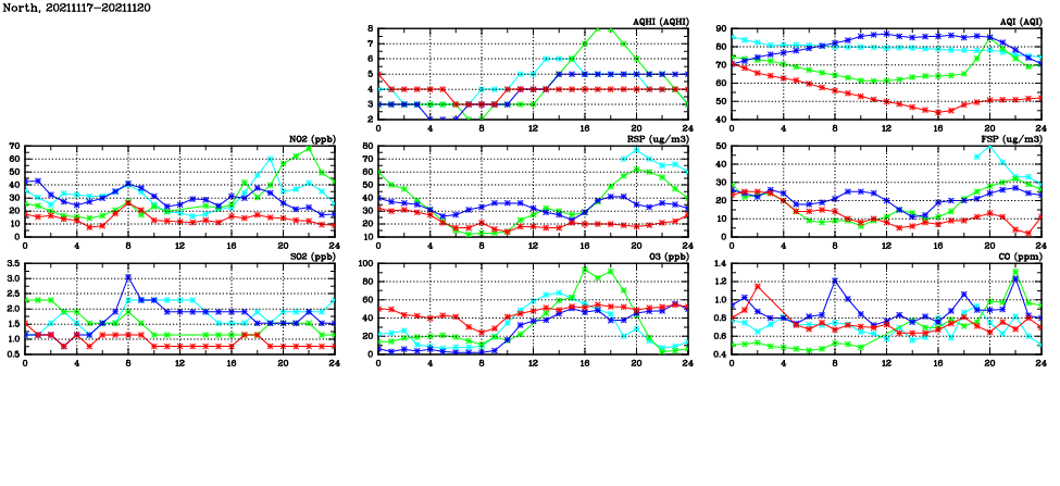 | Air Quality Data Time Series in North (2021/11/20) | ( Line colors: Day -3 Day -2 Day -1 Current day ) | 2D Map Current AQHI |