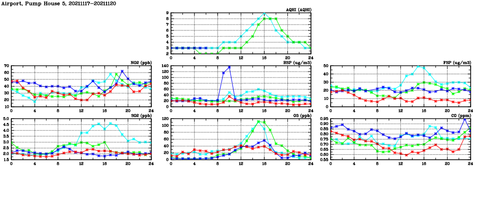 | Air Quality Data Time Series in Airport, Pump House 5 (2021/11/20) | ( Line colors: Day -3 Day -2 Day -1 Current day ) | 2D Map Current AQHI |