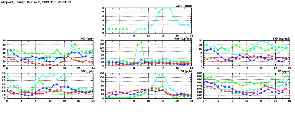 | Air Quality Data Time Series in Airport, Pump House 5 (2021/11/21) | ( Line colors: Day -3 Day -2 Day -1 Current day ) | 2D Map Current AQHI |