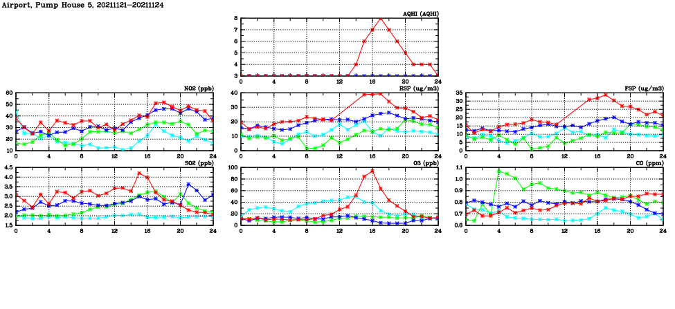 | Air Quality Data Time Series in Airport, Pump House 5 (2021/11/24) | ( Line colors: Day -3 Day -2 Day -1 Current day ) | 2D Map Current AQHI |