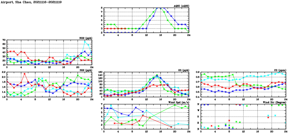 | Air Quality Data Time Series in Airport, Sha Chau (2021/11/19) | ( Line colors: Day -3 Day -2 Day -1 Current day ) | 2D Map Current AQHI |