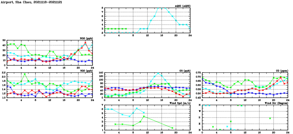 | Air Quality Data Time Series in Airport, Sha Chau (2021/11/21) | ( Line colors: Day -3 Day -2 Day -1 Current day ) | 2D Map Current AQHI |