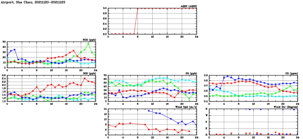 | Air Quality Data Time Series in Airport, Sha Chau (2021/11/23) | ( Line colors: Day -3 Day -2 Day -1 Current day ) | 2D Map Current AQHI |