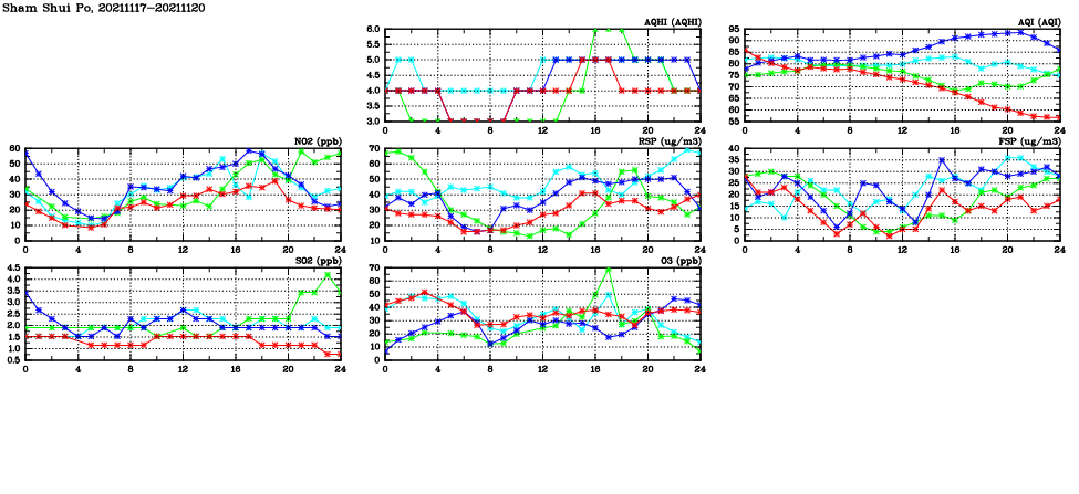 | Air Quality Data Time Series in Sham Shui Po (2021/11/20) | ( Line colors: Day -3 Day -2 Day -1 Current day ) | 2D Map Current AQHI |