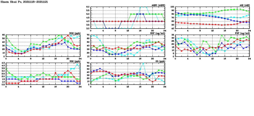 | Air Quality Data Time Series in Sham Shui Po (2021/11/21) | ( Line colors: Day -3 Day -2 Day -1 Current day ) | 2D Map Current AQHI |