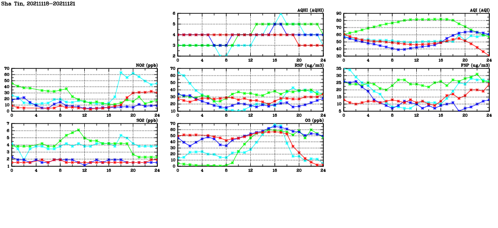 | Air Quality Data Time Series in Sha Tin (2021/11/21) | ( Line colors: Day -3 Day -2 Day -1 Current day ) | 2D Map Current AQHI |