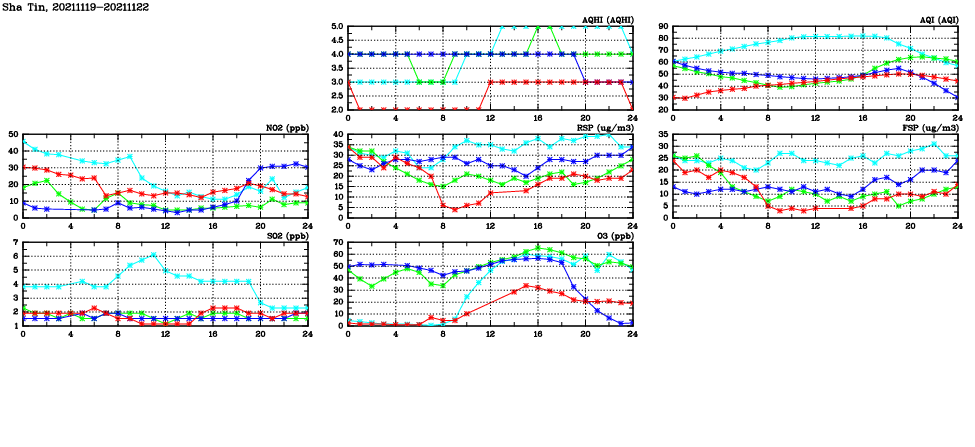 | Air Quality Data Time Series in Sha Tin (2021/11/22) | ( Line colors: Day -3 Day -2 Day -1 Current day ) | 2D Map Current AQHI |